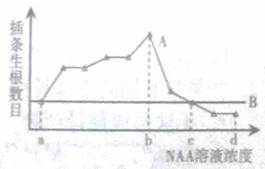 将若干生长状况相同的迎春花插条等分为n组,其中一组浸入清水中,其它组分别浸入不同浓度梯度的生长素类似物——萘乙酸(NAA)溶液中。浸泡24小时后同时取出,分别转入不同的烧杯中进行水培,一段时间后测量并记录插条生根数目,结果如图5所示。图中A代表不同浓度梯度的NAA溶液中插条生根数目变化曲线,B代表浸入清水中的插条生根数目。下列叙述不正确的是![]()
