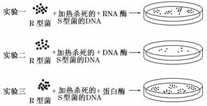 艾弗里等人为了弄清转化因子的本质,进行了一系列的实验,如图是他们所做的一组实验,则三个实验的培养皿中只存在一种菌落的是( )
