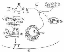 下图表示细胞内蛋白质合成后的去向和定位,其中①~⑦表示细胞结构,甲~丁表示结构中的物质。