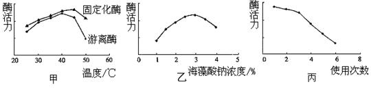 固定化酶是从20世纪60年代迅速发展起来的一种技术。科研人员用海藻酸钠作为包埋剂来固定小麦酯酶,以研究固定化酶的相关性质和最佳固定条件。酶活力为固定化酶催化化学反应的总效率,包括酶活性和酶的数量。下图甲、乙、丙为部分研究结果。下列有关叙述中,错误的是