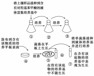 从土壤中分离能降解酚类化合物对羟基苯甲酸的微生物实验过程如图所示,请据图回答下列问题。