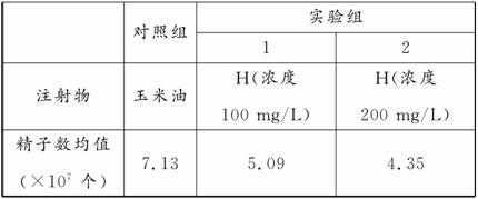 环境激素是指由于人类的生产和生活活动而排放到周围环境中的某些化学物质。为研究环境激素H对小鼠产生精子数的影响,用玉米油和环境激素H分别处理对照组和实验组雄性小鼠(每千克体重注射12.5mL,每天1次,连续21天,n=20)。实验结束后,对每只小鼠产生的精子计数。实验内容及结果见下表:
