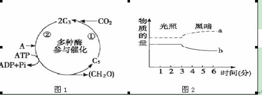图1表示光合作用部分过程的图解,图2表示改变光照后,与光合作用有关的五碳化合物和三碳化合物在细胞内的变化曲线。根据图完成下列问题: