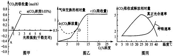 ①图甲中光合作用强度是用CO2吸收量(mol/h)表示的,如果改为O2的吸收量(mol/h)表示,请在图甲中再绘出光合作用强度与光照强度的关系曲线