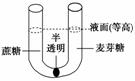 如图所示U型管中间被一种能允许水分子通过而二糖不能通过的半透膜隔开,现在两侧分别加入0.1 mol/L的蔗糖溶液和麦芽糖溶液,一段时间后左右两侧液面高度变化是怎样的?若向U型管右侧加入某种微量物质(不影响溶液浓度),右侧液面高度上升,那么加入的这种微量物质最可能是( )