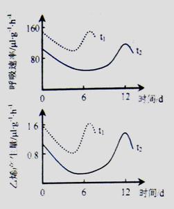 某种蔬菜离体叶片在黑暗中不同温度条件下呼吸速率和乙烯产生量的变化如图所示,t1t2?表示10-30°C之间的两个不同温度。下列分析正确的是()
