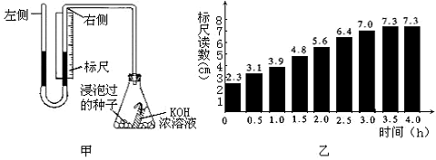 甲图是测量种子萌发时锥形瓶中气体体积变化的实验装置。锥形瓶中放的种子事先用水浸泡过并在稀释的消毒剂中清洗过(不影响种子生命力)。实验开始时U形管左侧与右侧液面相平,每隔半小时利用标尺量出右侧管内的液面高度变化,实验结果见乙图。回答下列问题: