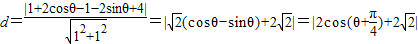 点评:本小题主要考查圆的参数方程、点到直线的距离公式、三角函数的和角公式及及三角函数的性质等基础知识,考查运算求解能力、化归与转化思想.属于基础题.