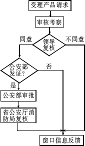 某省公安消防局对消防产品监督程序步骤:首先受理产品请求,如果由公安部发证的产品,则审核考察,领导复核,不同意,则由窗口信息反馈,同意,则报公安部审批,再把反馈信息由窗口反馈.如果不是由公安部发证的产品,则审核考察,领导复核,再由窗口信息反馈出去.