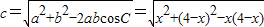 解答:解:有a2+b2-ab=c2得∠C=60°,设a=x,则b=4-x.此三角形的周长最小只要c边最小,