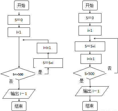 【答案】分析:(1)分析题目中的要求,发现这是一个累加型的问题,故可能用循环结构来实现,在编写算法的过程中要注意,计数的初始值为1,计数值每一次增加1,退出循环的条件是累加结果S≤500,即可得到流程图;