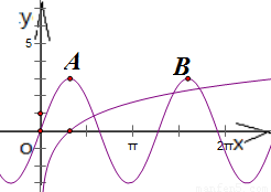 =4,在原点的右侧它的第一个最大值点为x=1,对应图中A(1,3),第二个最大值点为x=5,对应图中B(5,3)