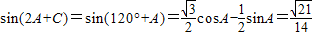 (II)先根据正弦定理求得sinA,进而求得cosA根据,再根据三角函数两角和公式求得sin(2A+C).