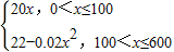 当100<x≤600时,y=(62-0.02x)x-40x=22x-0.02x