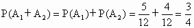 解法 1:(1)从12只球中任取1球得红球有5种取法,得黑球有4种取法,得红球或黑球共有5+4=9种不同取法,任取1球有12种取法.∴任取 1球得红球或黑球的概率为(2) 从12只球中任取1球得红球有5种取法,得黑球有4种取法,得白球有2种取法.从而得红球或黑球或白球的概率为解法 2:(利用互斥事件求概率)记事件