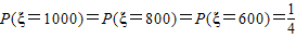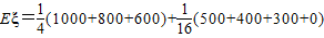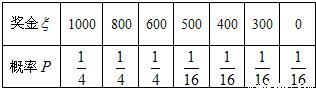 某公司为庆祝元旦举办了一次抽奖活动,现场准备的抽奖箱里放置了分别标有数字1000、800、600、0的四个球(球的大小相同).参与者随机从抽奖箱里摸取一球(取后即放回),公司即赠送与此球上所标数字等额的奖金(元),并规定摸到标有数字0的球时可以再摸一次,但是所得奖金减半(若再摸到标有数字0的球就没有第三次摸球机会),求一个参与抽奖活动的人可得奖金的期望值是多少元.