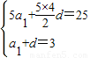 若等差数列{an}的前5项和S5=25,且a2=3,则a7=( )