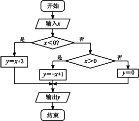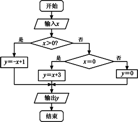 解:算法如下: 第一步:输入x; 第二步:如果x>0,则使y=-x+1,并转到第四步,否则,执行下一步; 第三步:如果x=0,则使y=0,否则,y=x+3; 第四步:输出y. 流程图如图所示.