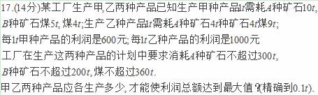 (14分)某厂用甲、乙两种原料生产A、B两种产品,已知生产1t A产品,1t B产品分别需要的甲、乙原料数,可获得的利润数及该厂现有原料数如下表所示.问:在现有原料下,A、B产品应各生产多少才能使利润总额最大?列产品和原料关系表如下: