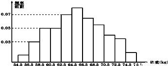 为了了解某地区高三学生的身体发育情况,抽查了该地区100名年龄为17.5岁-18岁的男生体重(kg),得到频率分布直方图如图.根据图可得这100名学生中体重在〔56.5,64.5〕的学生人数是( )