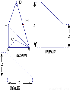 如图,是某直三棱柱(侧棱与底面垂直)被削 去上底后的直观图与三视图的侧视图、俯视图.在直观图中,M是BD的中点.侧视图是直角梯形,俯视图是等腰直角三角形,有关数据如图所示.