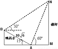 2010年11月12日广州亚运会上举行升旗仪式.如图,在坡度为15°的观礼台上,某一列座位所在直线AB与旗杆所在直线MN共面,在该列的第一个座位A和最后一个座位B测得旗杆顶端N的仰角分别为60°和30°,且座位A、B的距离为