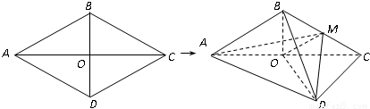如图,菱形ABCD的边长为6,∠BAD=60°,AC∩BD=O.将菱形ABCD沿对角线AC折起,得到三棱锥B-ACD,点M是棱BC的中点,