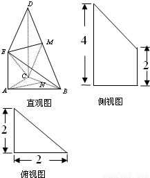 如图是某直三棱柱(侧棱与底面垂直)被削去上底后的直观图与三视图的侧视图、俯视图,在直观图中,M是BD的中点,侧视图是直角梯形,俯视图是等腰直角三角形,有关数据如图所示.