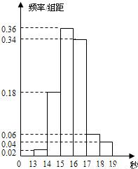 某班50名学生在一次百米测试中,成绩全部介于13秒与19秒之间,将测试结果按如下方式分成六组:每一组,成绩大于等于13秒且小于14秒;第二组,成绩大于等于14秒且小于15秒;…第六组,成绩大于等于18秒且小于等于19秒.如图是按上述分组方法得到的频率分布直方图.设成绩小于17秒的学生人数占全班人数的百分比为x,成绩大于等于15秒且小于17秒的学生人数为y,则从频率分布直方图中可以分析出x和y分别为( )