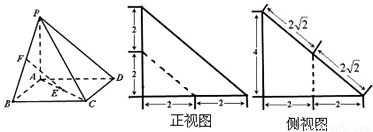 四棱锥P-ABCD的底面ABCD是正方形,E,F分别为AC和PB上的点,它的直观图,正视图,侧视图.如图所示,