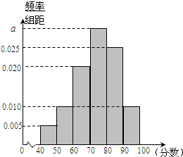 某校从高一年级学生中随机抽取40名学生,将他们的期中考试数学成绩(满分100分,成绩均为不低于40分的整数)分成六段:[40,50),[50,60),…,[90,100]后得到如图所示的频率分布直方图.