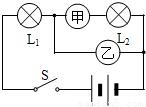 在如图所示电路中,闭合电键后,灯L1、L2均正常工作.甲、乙为电学仪表,其中甲是    表,测量的是    ;乙是    表,测量的是