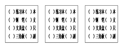 练习本每本0.5元,钢笔每支8元,文具盒每只12元,三角板每副3元,小刚带了20元钱,准备买其中的三种不同的文具,(其中每种文具可以买多件)。请你根据以上要求设计三种不同的购物方案。在下面相应的货物前的括号中打上√,并在后面的括号中填上相应的数量)
