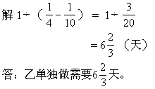 ★例3 有一项工程,甲队单独做需要10天,甲、乙两队合做需要4天,乙单独做需要几天?