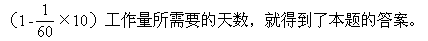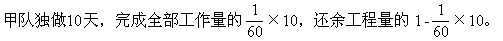 ★★例5 一项工程,甲队独做60天完成,乙队独做40天完成,现先由甲队独做10天后,乙队也参加工作。还需几天完成?