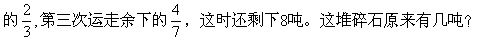 剩下的吨数÷对应的分率=碎石总数。题中三个分数的单位“ 1”不同。必须转化成都以一堆碎石为“1”的分数,然后求剩下的分率。