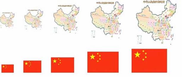 (电脑演示)出示一幅中国地图和国旗的平面图。再依次点击,出现一组大小不同的地图的平面图和国旗的平面图。