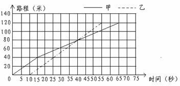 10、甲、乙两人比赛120米滑雪,乙让甲先滑10秒。他们两人滑的路程与时间的关系如下图。
