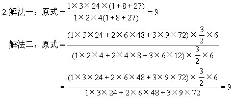 说明:解这道题可以从不同的角度来观察。解法一是先观察、比较分子部分每个加数(连乘积)的因数,发现了前后之间的倍数关系,从而把“1×3×24”作为公因数提到前面,分母部分也作了类似的变形。而解法二,是着眼于整个繁分数,由分子看到分母,发现分子部分的左、中、右三个乘