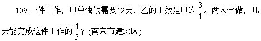 110.一项工作,甲单独做要10天完成,乙单独做要15天完成。甲、乙合做几天可以完成这项工作的80%?(浙江温岭市)