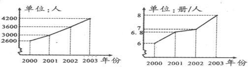 4.某中学图书馆为拓展学生知识面,近几年每年都购进大批图书。全校人均占有的图书册数逐年增加,该校2000年至2003年每年年底的学生总人数和人均占有图书册数的统计结果分别如下图: