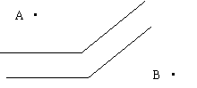 19、(1999年·模拟二)下图表示一条河,如果从A、B两村各修一条沟与大河连通,要使这两条沟最短,应该怎样修?请在图中画出来。(6%)
