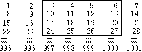 7、将1至1001各数如图1.6的方式排成一个长方形阵列,用一个正方形框出16个数,要使这个方框中的16个数之和等于(1)1968,(2)1988,(3)1991,(4)2000,这是否可能?若不可能,试说明理由;若可以办到,请写出该方框的16个数中最小及最大的数来。