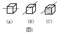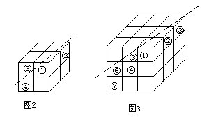 (1)铁丝穿透1个小立方体可有三种不同情况。(如图1所示)其中A、B两种是穿过相对两面,A种平行于棱的方向穿过,B种斜着穿过;C种则是穿过相邻两面。再进一步分析,若增加7个小立方体,搭成较大立方体时,这个小立方体相对两面中只能有一个面与其它小立方体相邻,也就是说只能考虑铁丝在一个方向上继续穿透其它小立方体。而这个小立方体相邻的两面可以分别与其它小立方体相邻,铁丝可以沿两个方向继续穿透其它小立方体。因此,C种情况是我们解答本题需要深入考虑的。(为了便于分析,将这个小立方体编为①号。)