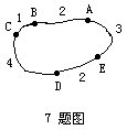 7.一条环形公路上有五个仓库(如图),数字表示各段路的千米数,A仓存粮50吨,B仓存粮5吨,C仓存粮10吨,D仓存粮35吨.现在要调整存放数,每个仓库存粮各20吨.已知每吨粮运1千米为5元,那么完成上述调运计划,最节省的方案运费需要______元.