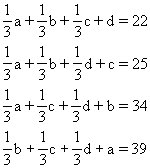 由这四个式子可以看出22+25+34+39之和恰好是a、b、c、d四个数之和的2倍,所以