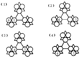29.将1-9填入下列各图的九个○中(其中6和1已填好),使得每个三角形上的三个数之和都相等: