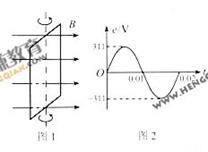 在匀强磁场中,一矩形金属线框绕与磁感线垂直的转轴匀速转动,如图1所示。产生的交变电动势的图像如图2所示,则