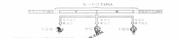 5.土壤农杆菌能将自身Ti的质粒的T-DNA整合到植物染色体DNA上,诱发植物形成肿瘤。T-DNA中含有植物生长素合成酶基因(S)和细胞分裂素合成酶基因(R),它们的表达与否能影响相应植物激素的含量,进而调节肿瘤组织的生长与分化。