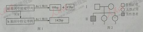 6、某致病基因h位于X染色体上,该基因和正常基因H中的某一特定序列BclI酶切后,可产生大小不同的片段(如图1,bp表示碱基对),据此可进行基因诊断。图2为某家庭病的遗传系谱。